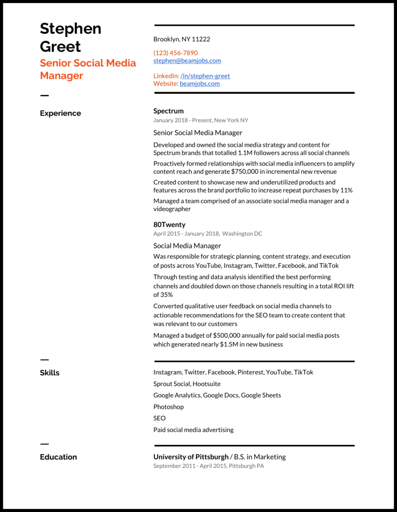Social media manager resume example ✓ complete guide ✓ create a perfect resume in 5 minutes using our resume examples & templates. Enter the social media manager, the professional who monitors and runs the company's social networks. Social media managers oversee an organization's social media activities. On a social media marketing resume, the top of the funnel is the heading statement, known as here is how to list social media skills on resumes: Including the right resume keywords and social media skills on your resume is key. Here, though, you'll give them your career goals to show you fit their demographic. No matter what stage you're at in your career, we have you covered. Social media specialist resume sample. These resumes have helped social media managers get jobs at great companies like lyft and grubhub. A dynamic, motivated, social media marketing specialist with the educational background and now that you've seen an example of a job winning social media marketing specialist resume, here are. Here are some examples and ways you can show off your work. You know that you are great at handling social media, your peers know that too, but that will not land you the dream job. Land your dream job in social media: